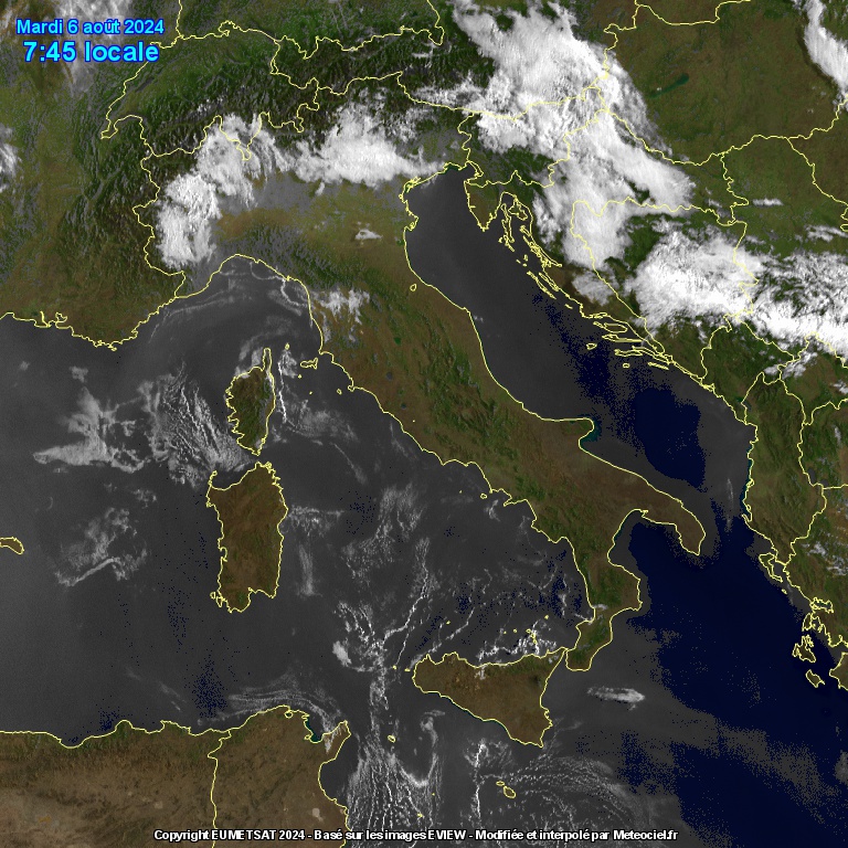 A parte un po’ di nubi sulla fascia prealpina, sul resto della Penisola il cielo si presenta sereno. Nel corso della giornata aumenterà il rischio temporalesco su Alpi ed Appennini con possibili sconfinamenti verso le pianure del nord in serata. I temporali si faranno notare sull’Italia fino a giovedi 8 agosto, poi nel fine settimana sembra probabile una nuova ondata di caldo, ma ne parleremo in separata sede.