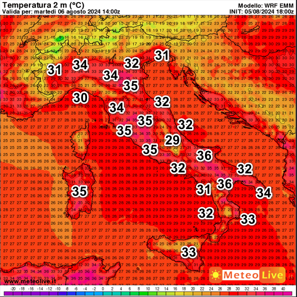 Punte di 36° sulla Lucania e nel Foggiano, 35° in Sardegna, sull’Emilia Romagna e sull’Umbria.