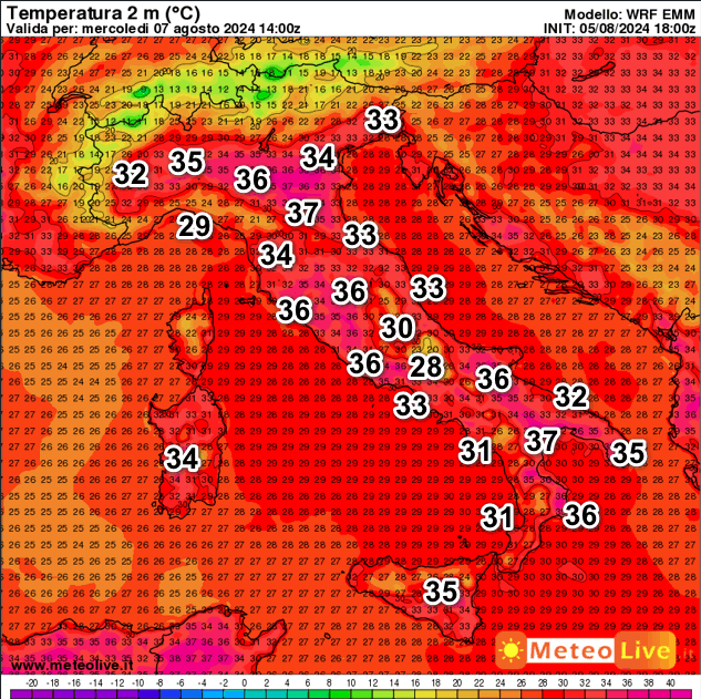 Queste invece sono le temperature attese in Italia alle ore 16 di domani pomeriggio, mercoledi 7 agosto: