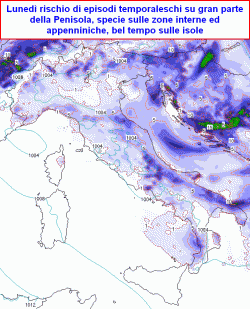 Nel pomeriggio-sera possibili temporali sparsi sul settentrione, specie su Alpi, Lombardia centro-orientale e Triveneto. Al centro solo sporadici rovesci in Appennino, al sud bel tempo. Temperature in calo nei valori massimi al nord, stazionaria al centro, in aumento al sud.