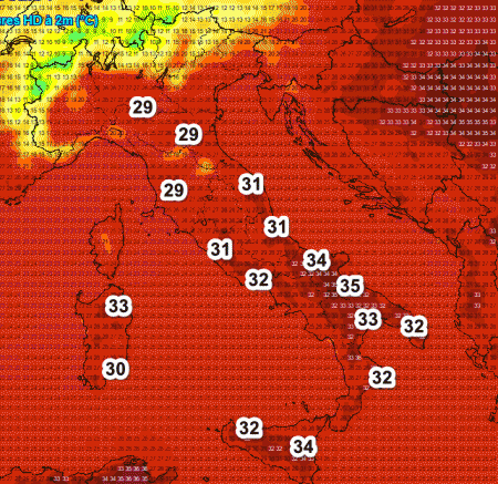 Ancora caldo al sud con punte di 35° sulla Puglia e 34° sulla Sicilia orientale. Valori più stemperati al nord e sulla Toscana, in genere sotto i 30°.