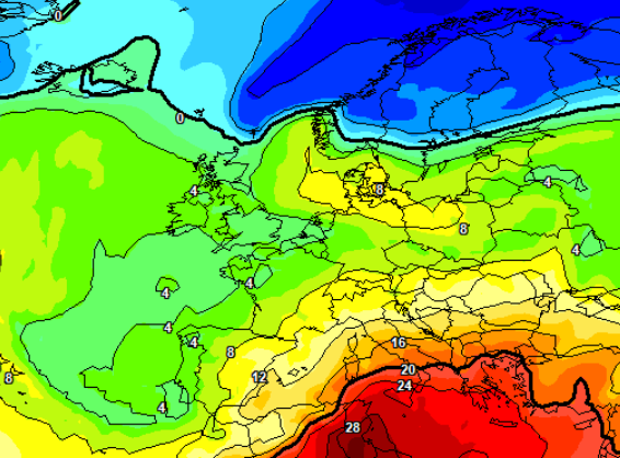 Il sud invece vedrà le temperature schizzare in alto a causa dell’arrivo di questa massa d’aria calda, che potrebbe essere temporaneo, ma che farà sembrare ormai di essere piombati in piena estate, specie su Sicilia, Calabria e Puglia, qui le temperature previste per mercoledì 16 dal modello europeo a 1500m, guardate che gradiente termico tra Portogallo e Sicilia, ma anche tra nord e sud Italia: