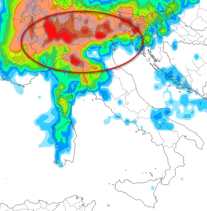 Oltre 100mm di pioggia in sole 24 ore e nell’arco dell’intera fase perturbata potrebbero registrarsi accumuli anche di 200mm. Il centro si troverà al limite tra la zona perturbata e il rientro di aria calda dal nord Africa stimolato proprio dall’avvicinamento del ciclone e a tratti pioverà su Toscana, Umbria, Lazio, meno in Adriatico, protetto dall’Appennino rispetto alle correnti di Libeccio.