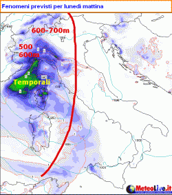 PREVISIONE PER DOMANI: condizioni di spiccata instabilità su tutto il Paese, copn precipitazioni più probabili e frequenti su val Padana, Liguria, Emilia, Romagna, Isole Maggiori e su tutto il centro-sud. Nevicate fino a 1000 metri al centro-nord, 1200 metri al sud. Piuttosto freddo per la stagione. Burrasca di Maestrale sulle Isole Maggiori, con possibilità di mareggiate lungo le coste esposte.