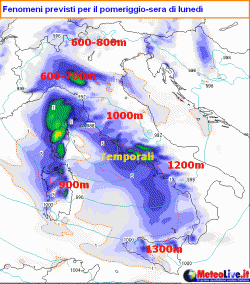 NEVICATE: previste lunedì intorno a 500-600 metri sul Piemonte, intorno a 600-700 metri sul resto del nord, 900-1000 sull’Appennino centrale in Sardegna, 1200-1300 metri su Appennino meridionale e Sicilia.