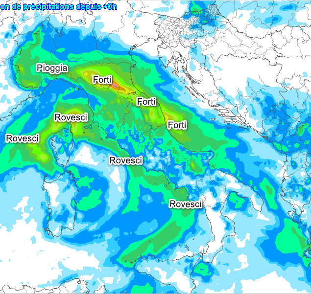 Al momento i fenomeni più intensi sono presenti tra l’Emilia Romagna, la bassa Lombardia, la Liguria ed il basso Piemonte, ma nel corso della giornata quasi tutta l’Italia verrà interessata da piogge e rovesci anche di forte intensità.