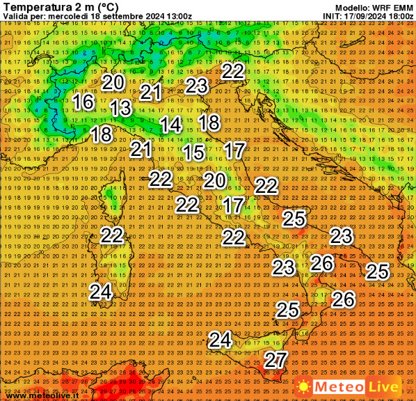 Temperature in calo su parte del nord e del centro dove avremo valori inferiori a 20°. Lieve aumento termico invece al sud con punte di 27° in Sicilia e 26° tra Calabria Ionica e Lucania.