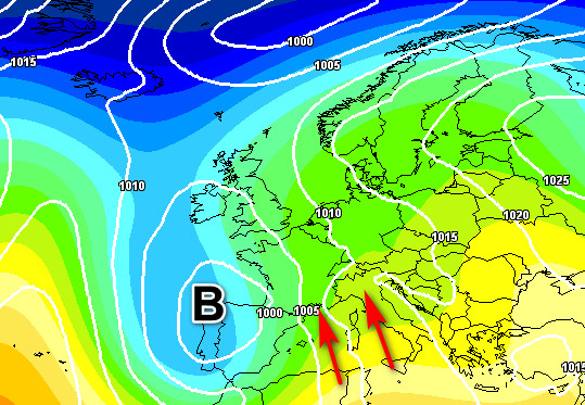 Ecco la depressione responsabile del peggioramento del tempo su tutta l’Europa occidentale ed in tendenza anche verso l’Italia ad iniziare dal settori occidentali. Le frecce rosse testimoniano il richiamo di correnti umide meridionali che precederanno una perturbazione piuttosto intensa.