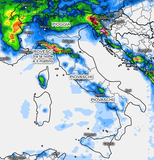 Giornata molto evolutiva: tra la notte e la prima mattinata rovesci sulla Liguria centro-orientale, specie sui rilievi. Piogge sparse tra est Lombardia e Triveneto ad eccezione dell’Emilia Romagna. Neve nella notte su tutto l’arco alpino (ad eccezione delle Alpi Marittime) in media tra i 900 ed i 1100 metri. Da metà giornata migliora al nord con residue nevicate sulle Alpi, ma con quota neve in rialzo fino a 1600 metri. Piovaschi sul Tirreno specie sulla Campania, per il resto tempo asciutto. Clima molto mite e ventoso a parte le sacche fredde in Valpadana.