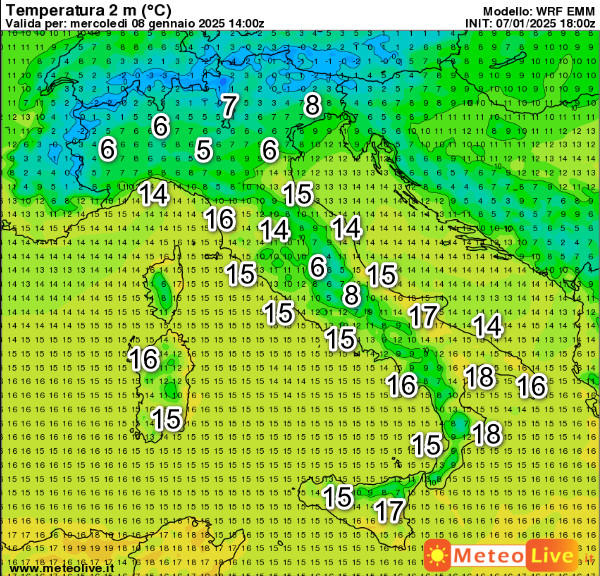 Questi sono i valori termici attesi sul nostro Paese alle ore 15 di mercoledi 8 gennaio: