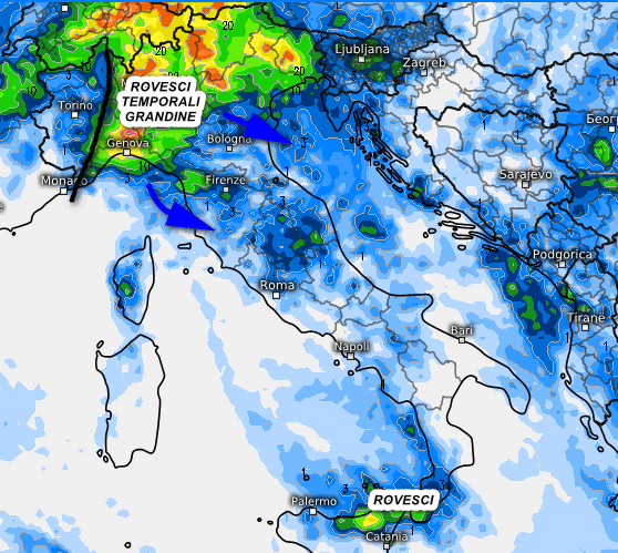 Al mattino e nel primo pomeriggio ancora rovesci all’estremo sud, specie tra la Calabria e la Sicilia, ma in via di attenuazione. Cielo sereno o velato altrove. Tra il pomeriggio e la serata nubi a sviluppo verticale sul Piemonte e l’ovest della Lombardia con rischio di rovesci e qualche temporale localmente accompagnato da grandine. I fenomeni si dirigeranno tra la sera e la notte verso il settore centro-occidentale della Liguria e verso levante, con probabili celle temporalesche anche sul mare. Crollo termico vistoso sotto i rovesci stante il rovesciamento dell’aria fredda dalla quota al suolo.