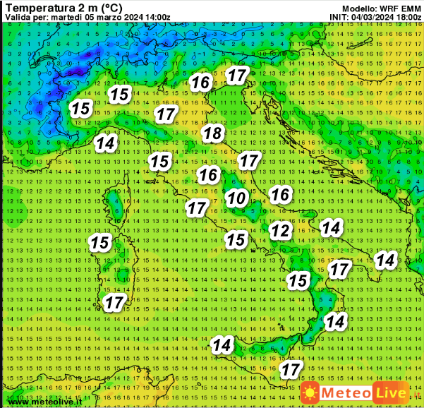 Valori molto miti ovunque con punte di 17-18° al sud, sulle Isole e sul nord-est. Forte calo termico sotto i rovesci in arrivo dal pomeriggio al nord.