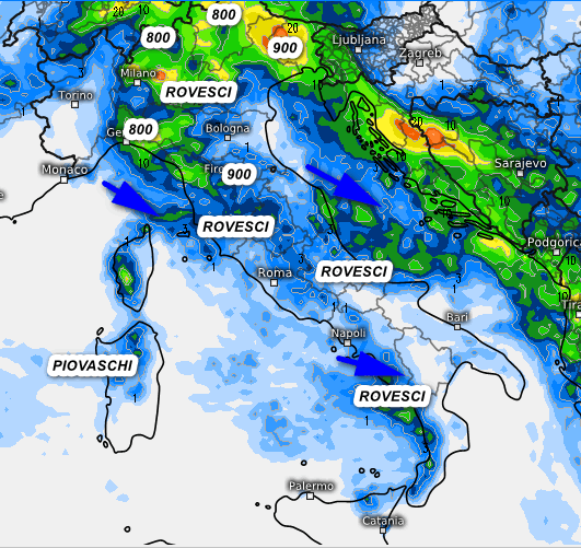 Instabile al nord-est, regioni centrali, Sardegna, Campania e Calabria Tirrenica con rovesci e nevicate oltre gli 800 metri al nord, 1000-1200 metri sull’Appennino centro-settentrionale. Migliora in giornata al nord-ovest con schiarite, assenza di fenomeni sul settore ionico. Rotazione delle correnti a nord-ovest e generale calo termico.