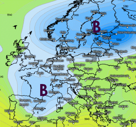 Ecco la mappa barica prevista per mercoledì 10 aprile a 5500m: si evince chiaramente la saccatura colma di aria fredda che proverà ad impossessarsi dell’Italia: