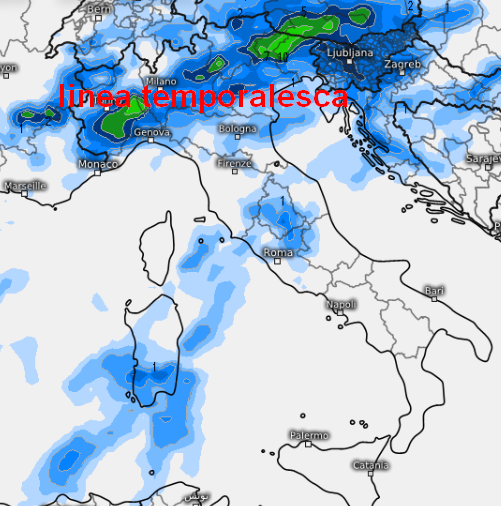 Ed ecco il quadro precipitativo dal quale si nota la linea temporalesca attiva al nord (sempre riferita a domenica 9 giugno) e deboli piogge derivanti dal classico fronte caldo africano sulle regioni centrali e la Sardegna: i classici piovaschi in aria calda già osservati spesso anche nelle scorse estati: