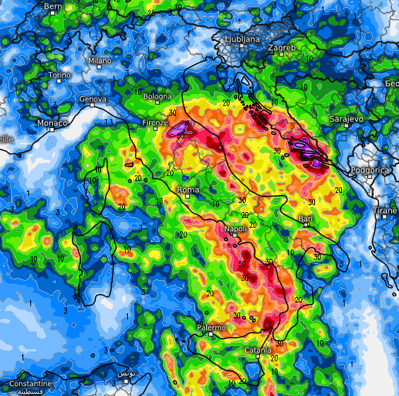 Tutto il centro-sud però colpito, come mostra la mappa successiva, da Napoli a Messina, ma anche sul medio Adriatico tra la Romagna e l’Abruzzo, piogge non abbondanti ma confortanti dovrebbero coinvolgere finalmente anche la Puglia, in miglioramento invece la situazione al nord: