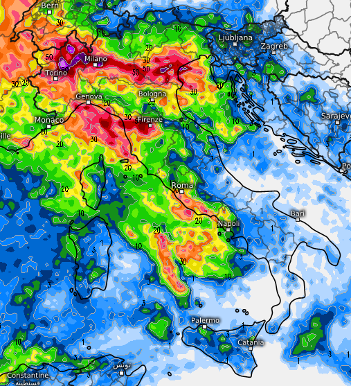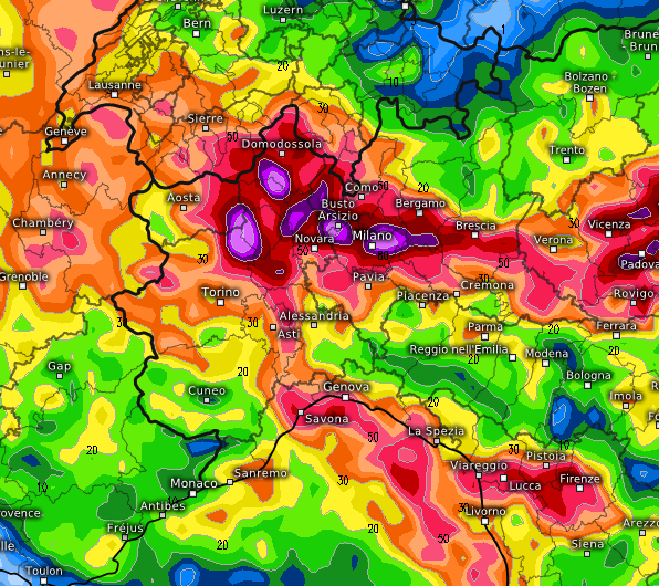 Lo zoom lo dedichiamo però all’area del Milanese e del Varesotto che potrebbero anche accumulare 80mm di pioggia in poche ore, una situazione che avrebbe certamente conseguenze sul territorio con allagamenti e disagi, notate anche i temporali su Padova, Firenze, Genova, Savona, Vicenza, Rovigo, Lucca, Viareggio: