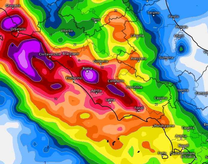 La mappa qui sotto mostra la fase iniziale del peggioramento, sono gli accumuli previsti tra mercoledì 4 e giovedì 5 con il nord sugli scudi, ma anche la Toscana e il Lazio: