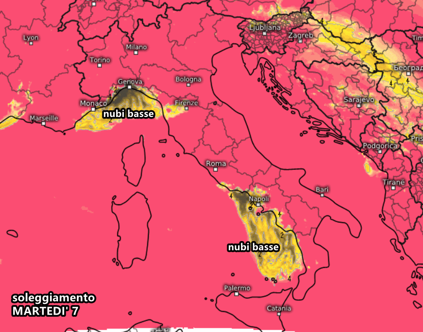 Le nubi basse aumenteranno anche sulle zone costiere della Campania e della Calabria tirrenica, anche in questo caso per effetto della troppa umidità presente nei bassi strati, come ci mostra il modello Swiss su base grafica Meteologix, nell’immagine qui sopra.