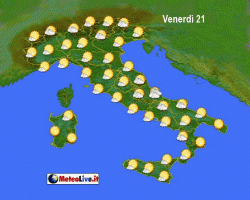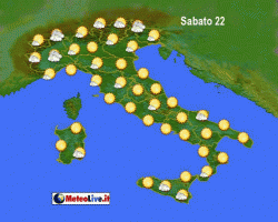 Afflusso di aria calda da domenica al sud e sulle isole, che risulterà invece piuttosto umida al settentrione e su parte del centro, determinando annuvolamenti irregolari e anche qualche debole e sporadica pioggia. Lunedì transita una debole perturbazione al nord con piogge sparse, riflessi parziali anche al centro con qualche piovasco in Toscana, bello al sud e sulle isole con caldo estivo. Martedì migliora ovunque, mercoledì di nuovo qualche pioggia al settentrione. Sempre caldo al sud.