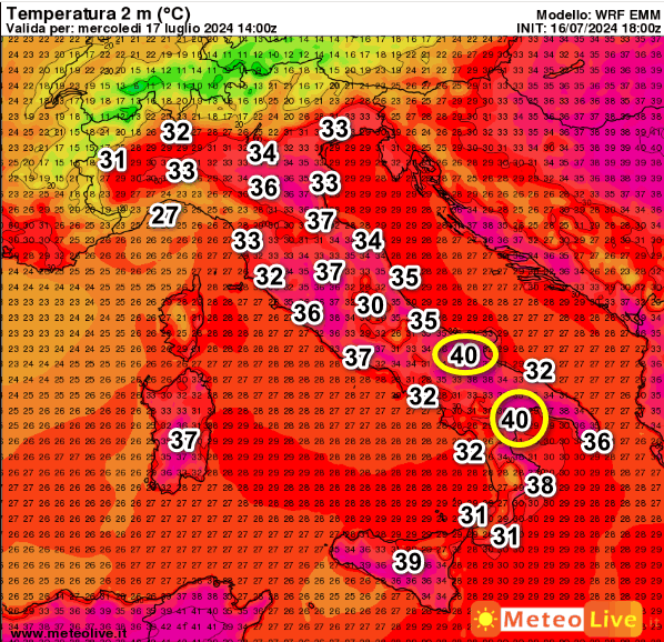 Ritroviamo i soliti 40° nel Foggiano e sulla Lucania, 39° in Sicilia, 38° sulla Calabria Ionica. Attenzione sempre al DISAGIO da CALDO previsto sempre molto elevato da nord a sud.