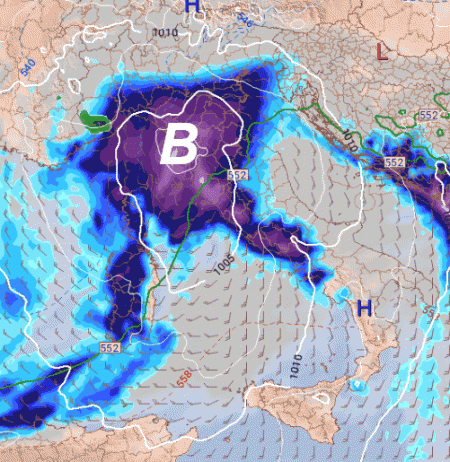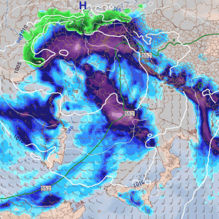 Da notare anche le nevicate sul settore alpino sin verso i 1400-1500m, localmente più in basso. Altri temporali investiranno le zone costiere e piogge diffuse il catino padano, in successivo spostamento verso il nord-est ma ancora con il Tirreno impegnato, come mostra l’evoluzione per il pomeriggio di giovedì: