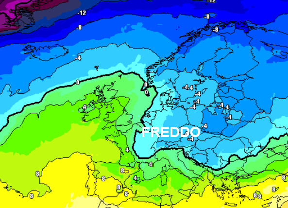 Notiamo l’isoterma 0° appoggiarsi alle Alpi, con valori di -2° sempre a 1500 metri subito a nord. In Italia arriverebbero isoterme comprese tra 1 e 4°, con valori ovviamente più elevati al meridione.