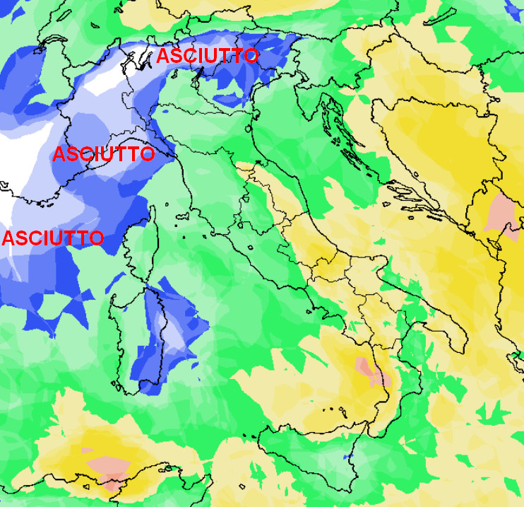 Notiamo come le piogge (e le nevicate in Appennino in media oltre i 1500-1700 metri) colpiranno soprattutto il centro e il sud, in modo particolare il medio-basso Adriatico e il meridione peninsulare. Quasi assenti le piogge al nord, ad eccezione dell’Emilia Romagna; piogge poco probabili anche sulla Sardegna orientale.