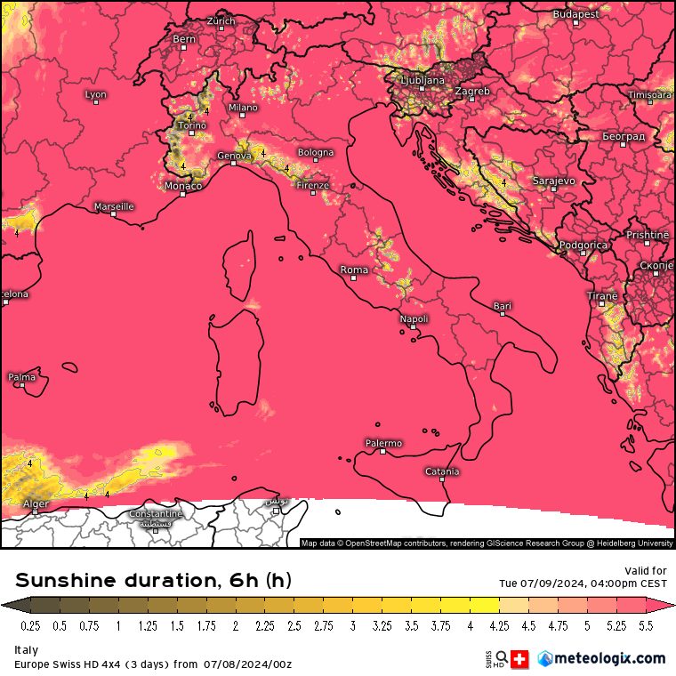 Infine, questo è il soleggiamento totale cumulato previsto tra le 9 e le 16 di martedi 9 luglio (rosa molto soleggiato, giallo nubi e schiarite, grigio scuro assenza di sole):