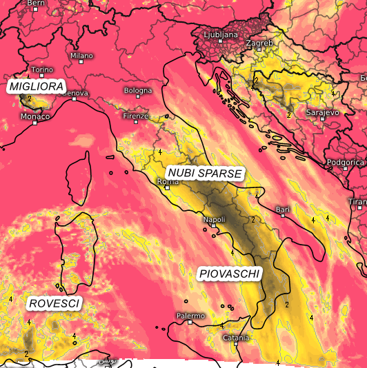 Sul nord-ovest ultimi rovesci sul settore delle Alpi Marittime, ma in via di rapida attenuazione; sul resto del nord soleggiato con le ultime incertezze lungo l’Appennino Emiliano senza fenomeni. Al centro bello sulla Toscana, nubi sparse altrove con qualche isolato piovasco specie nelle aree interne e sulla Sicilia orientale, ma cose di poco conto. Rovesci leggermente più convinti nei pressi della Sardegna, ma anche qui la situazione tenderà a migliorare nell’arco della giornata.