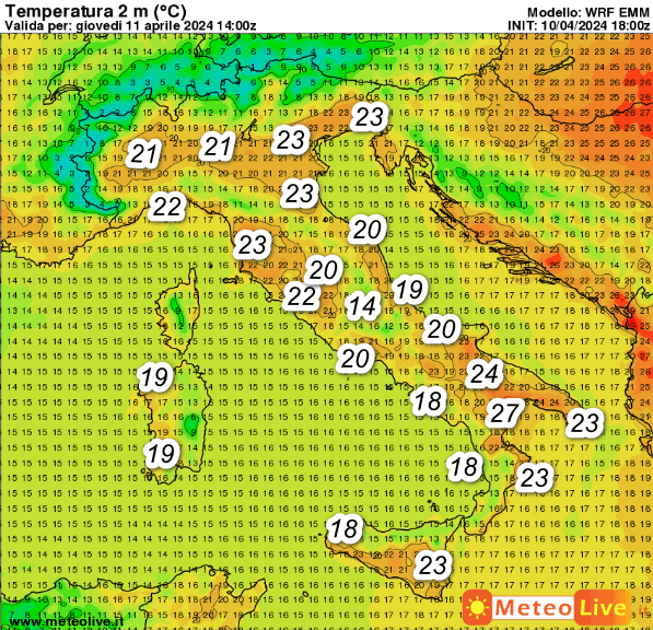 Temperature in aumento al nord e sulla Sardegna, in contenuto calo su alcune aree del meridione. Prevediamo comunque una punta di 27° in prossimità della bassa Lucania, per il resto valori nel complesso gradevoli.