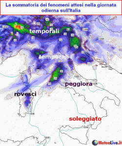 OGGI: al nord-ovest tempo variabile con qualche breve rovescio o temporale ma anche schiarite e con fenomeni più probabili tra Piemonte e Lombardia. Al nord-est e sull’Emilia-Romagna instabile con frequenti rovesci a sfondo temporalesco alternati a brevi schiarite o pause asciutte. Al centro nuvoloso o molto nuvoloso con rovesci sparsi e qualche temporale, localmente di forte intensità e accompagnato da grandine e colpi di vento. Sulla Sardegna variabile con rovesci o isolati temporali. Al sud nubi in arrivo su Campania e Molise ma con basso rischio di pioggia, per il resto soleggiato e ancora abbastanza caldo. In serata attenuazione dei fenomeni al nord-ovest.