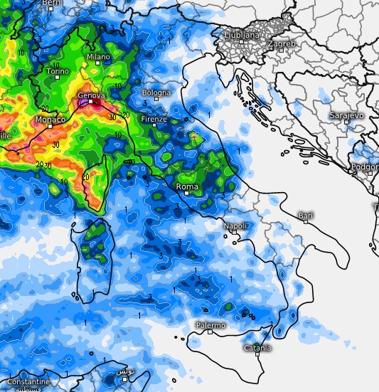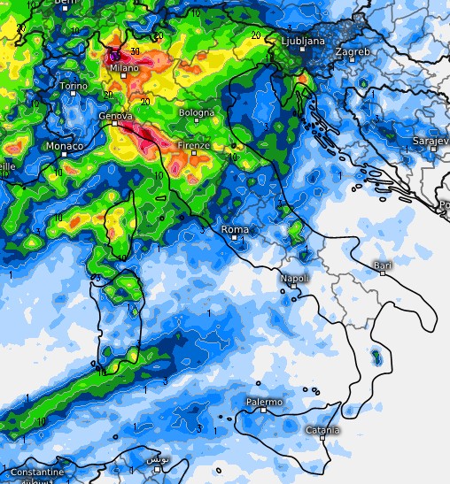 I fenomeni più rilevanti si andrebbero a concentrare su Lombardia, Triveneto, Levante ligure ed alta Toscana. Da valutare la strisciata temporalesca presente sul sud Sardegna, potrebbe investire nel pomeriggio del 6 le coste della Campania, ma si tratta ovviamente solo di una proiezione previsionale da non prendere alla lettera, così come paiono poco probabili anche le deboli piogge attese dal modello sulla Sicilia.