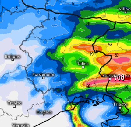 Piogge previste sul Friuli fra lunedì e martedì, specie sulla parte orientale, con picchi fino a 60mm
