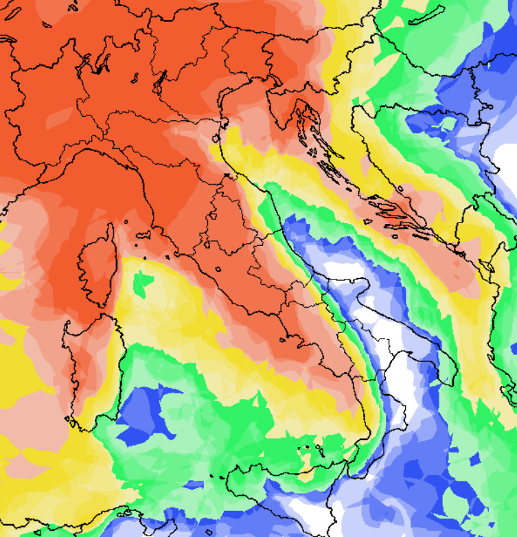 Probabilità di pioggia MOLTO ELEVATA al nord, sul Tirreno, le aree interne e la Sardegna occidentale. Piogge invece praticamente ASSENTI sul medio-basso Adriatico e sulle estreme regioni meridionali.