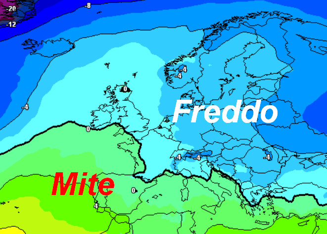 CONFERME: PRIMI GIORNI DI FEBBRAIO CON CLIMA PIU FREDDO; anche oggi sembra probabile un cambio di scenario radicale in Europa nei primi giorni di febbraio che porterà aria fredda anche in direzione dell’Italia. La terza mappa mostra le temperature a 1500 metri attese sulla nostra Penisola nelle ore centrali di lunedi 3 febbraio, sempre secondo la media degli scenari del modello GFS: