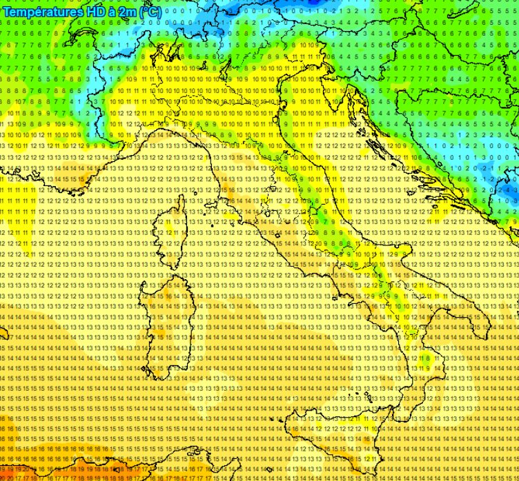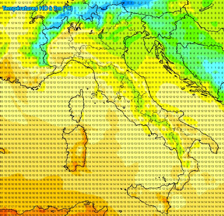 Ecco la massime previste per giovedì 25 alle 14 dal modello americano, addirittura sottostimate perché l’effetto favonico sul basso Piemonte potrebbe far schizzare i termometri anche molto più in alto, così come nel sud della Sardegna.