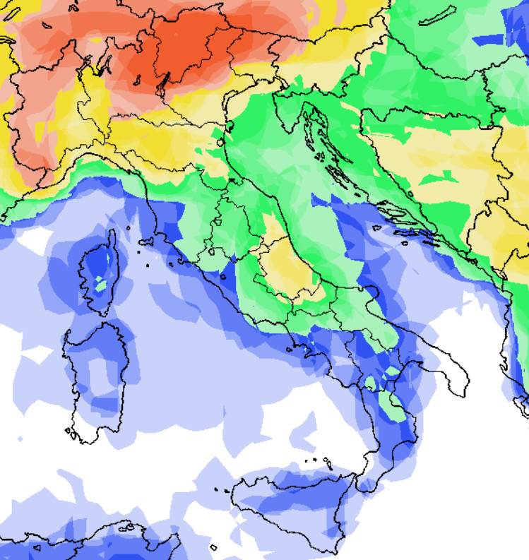 Dall’analisi emerge una probabilità di fenomeni temporaleschi elevata o molto elevata su Alpi, Prealpi e sulle alte pianure dell’Italia settentrionale. In queste aree, i temporali potrebbero risultare anche di forte intensità, accompagnati da grandine e colpi di vento. La probabilità si manterrà tra media ed elevata anche sul resto del Settentrione, così come nelle aree interne del Centro e su alcuni settori del Meridione. Altrove, specialmente sulle Isole Maggiori e sulle estreme regioni meridionali, la probabilità di rovesci sarà decisamente più bassa, se non addirittura nulla, confermando la persistenza di condizioni più stabili in queste zone.