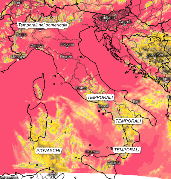 Sul fronte delle temperature, questi sono i valori attesi in Italia alle ore 16 di oggi pomeriggio: