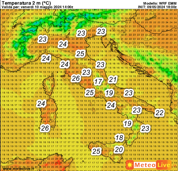 Valori nel complesso gradevoli da nord a sud. Punte di 26° sulla Sardegna meridionale e tra la Toscana e l’alto Lazio.