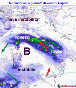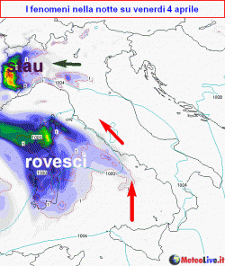 PEGGIORAMENTO: la saccatura in arrivo giovedì 3 aprile troverà difficoltà nel penetrare verso il centro del Continente e sprofonderà sul Mediterraneo centrale evolvendo in un minimo chiuso che coinvolgerà soprattutto il centro-sud del nostro Paese con fenomeni temporaleschi sparsi e rovesci. Ci sarà un richiamo di venti da est in Valpadana davanti al vortice che potrebbe provocare qualche fenomeno da stau orografico sull’ovest del Piemonte, mentre lo Scirocco si farà sentire al centro-sud.