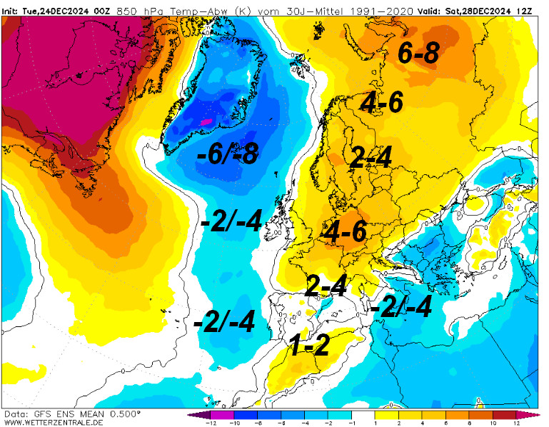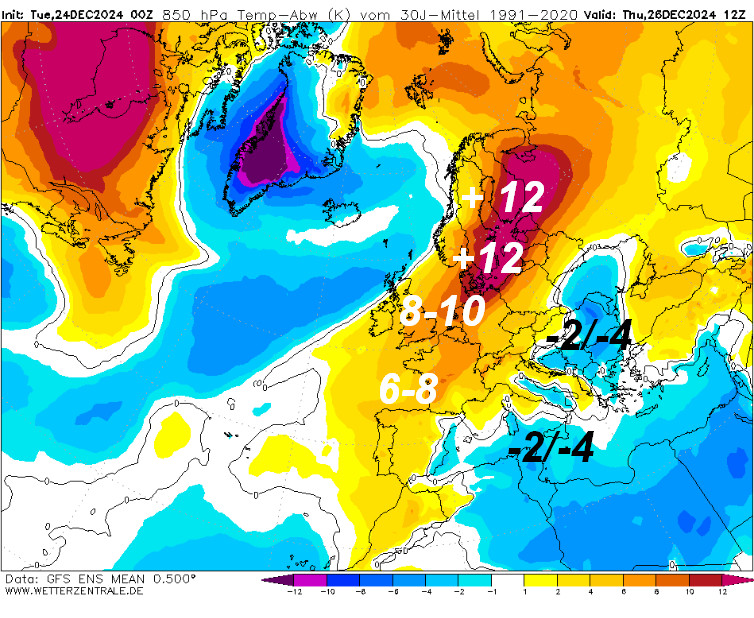 Nei prossimi giorni il Continente Europeo vedrà una situazione termica abbastanza singolare. Vi mostriamo le anomalie termiche a 1500 metri attese fino a sabato 28 dicembre.
