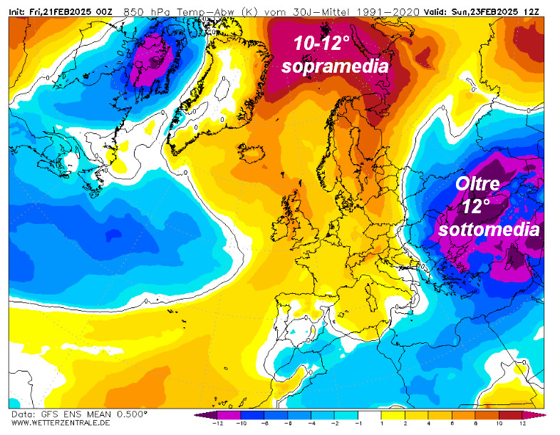 La prima cartina mostra le anomalie termiche a 1500 metri attese in Europa e zone limitrofe nelle ore centrali della giornata di domenica 23 febbraio: