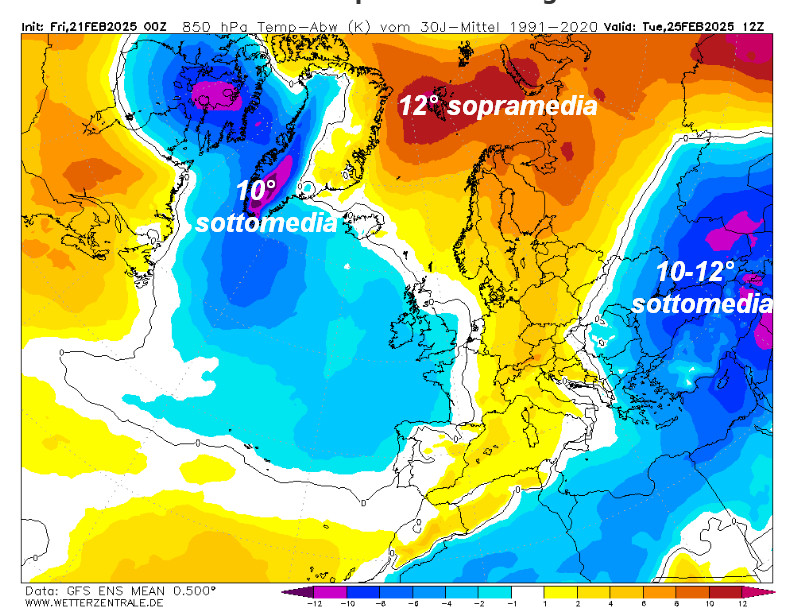Cosa succederà in Europa all’inizio della settimana prossima, sempre dal punto di vista termico? La seconda cartina mostra le anomalie termiche a 1500 metri previste per le ore centrali di martedi 25 febbraio:
