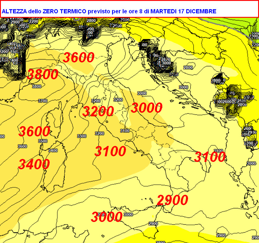 La mappa che vi mostriamo indica l’altezza dello zero termico sulla verticale italica nella mattinata di martedi 17 dicembre. Vi ricordiamo che per “zero termico” si intende la quota in cui si registra la temperatura di 0° in aria libera, ovvero priva di inversioni termiche.