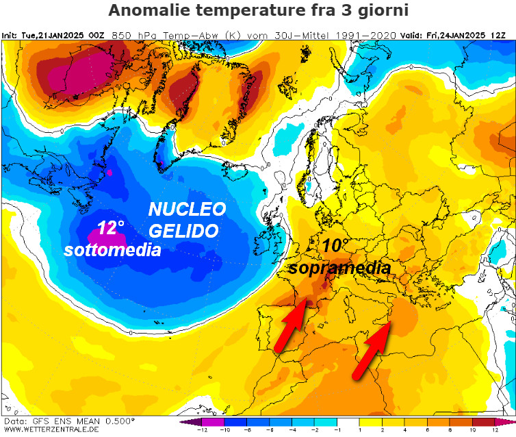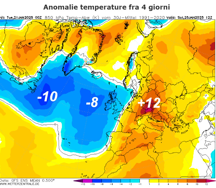 La seconda mappa mostra le anomalie termiche a 1500 metri previste in Europa nelle ore centrali di sabato 25 gennaio: