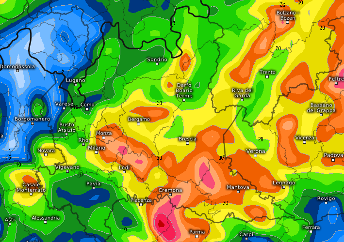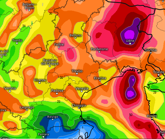 Come vedete gli accumuli più rilevanti (sotto forma di temporali e nubifragi) andrebbero andrebbero dalla Lombardia (iniziando da Como e Lecco e relative Prealpi) sino al Veneto a macchia di leopardo. La città di UDINE risulterebbe colpita da almeno un forte temporale, probabilmente a carattere di nubifragio.