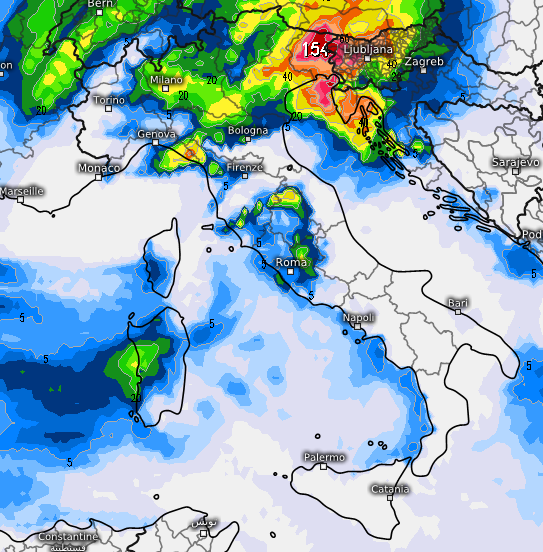 Nella mappa successiva si notano gli accumuli complessivi previsti tra le 21 di questa sera e le 14 di giovedì 12 settembre, si nota nettamente che sarà proprio il Triveneto il settore più coinvolto da linee temporalesche molto intense, con accumuli complessivi anche superiori ai 140mm in poche ore, in aggiunta comincia a delinearsi anche il maltempo sulle Apuane in alta Toscana e quello nell’Oristanese in Sardegna: