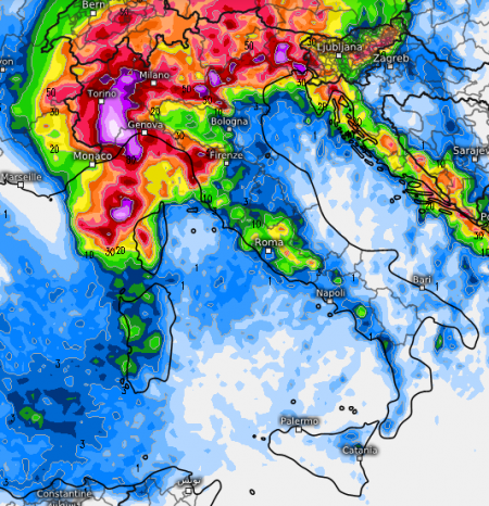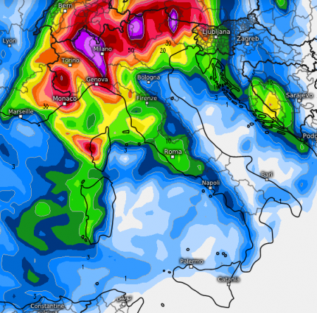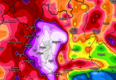 La grande parte dei modelli vede concentrarsi i fenomeni più eclatanti, anche superiori ai 100mm in sole 24 ore soprattutto nel Milanese, ed è sorprendente, perchè non era affatto scontato, a seguire c’è anche il Genovesato e per alcuni il Piemonte, Torino compresa.