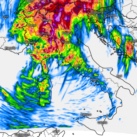 Condizioni di severo maltempo al nord e su parte delle regioni tirreniche.